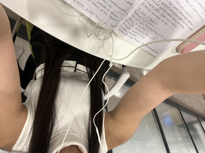 - "A first-person perspective image captures an individual seated at a white desk in an indoor environment" by FM-ANxO02, licensed under CC BY 4.0