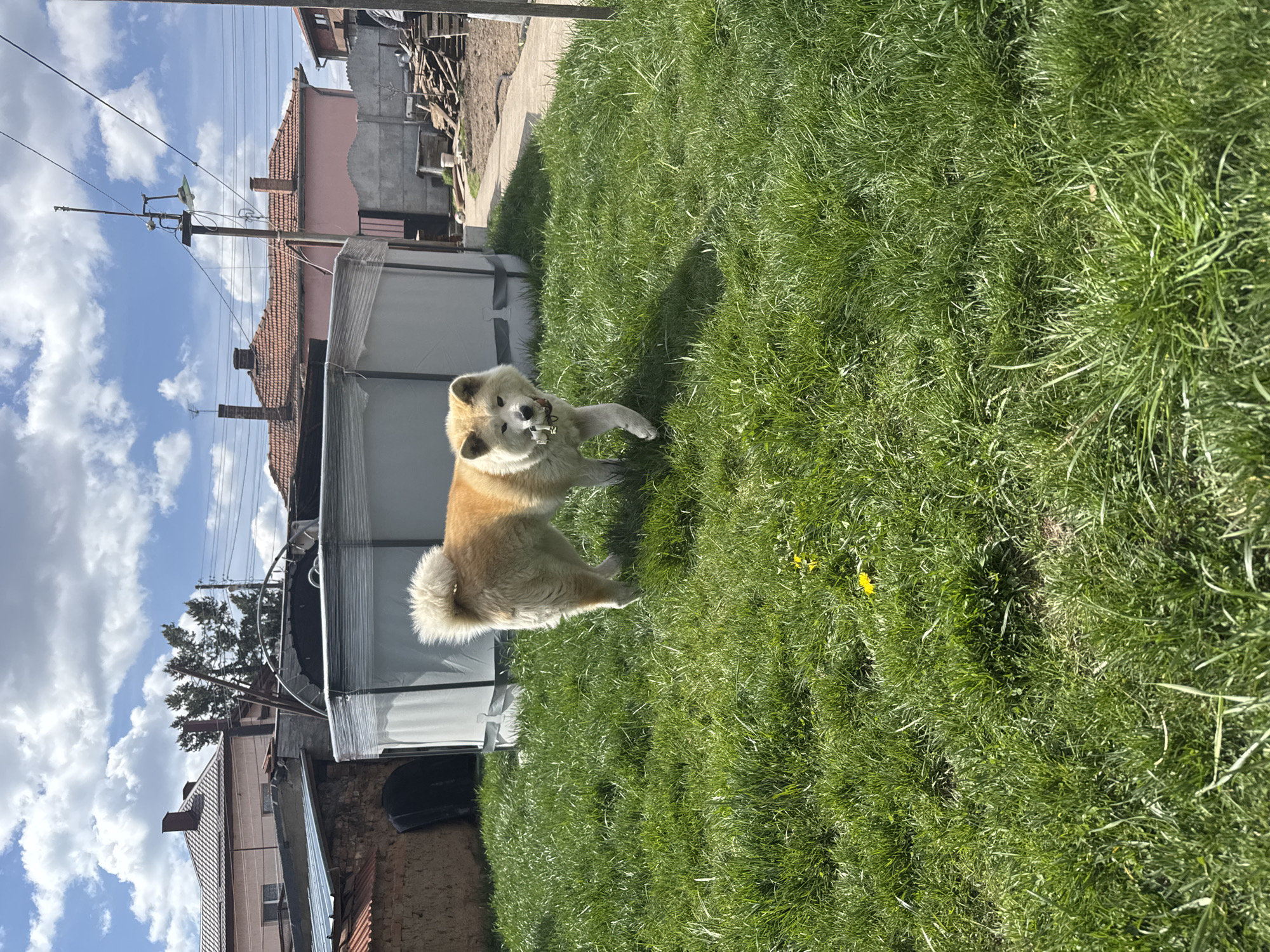 The image depicts an Akita dog standing on a patch of green grass in a yard. The dog is medium-sized, with a tan coat and a bushy tail. The background includes buildings, trees, and a partly cloudy sky. Utility poles with power lines are visible. The location is Novi Iskar, Bulgaria, suggested by the architectural style of the buildings.