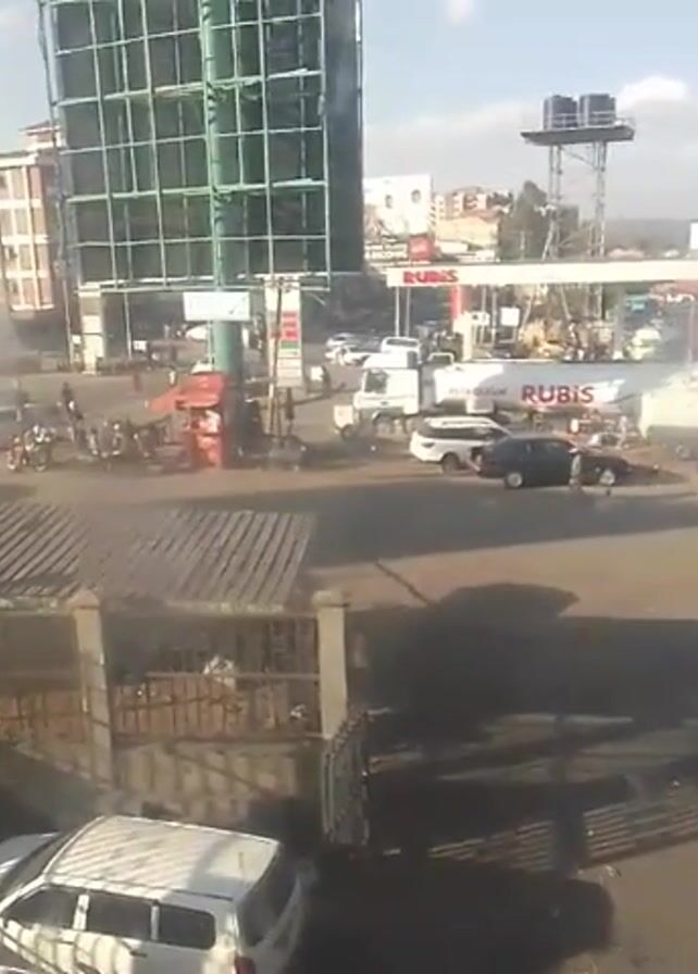 daytime, static, elevated shot of a busy intersection near a RUBIS gas station in what appears to be a city. Multiple vehicles, including cars, motorcycles, and a large white tanker truck, are visible. There are people walking around, and some appear to be congregating near the gas station and a small red structure. A tall building with a green, grid-like facade stands prominently on the left side of the frame. In the foreground, there is a fence with a gate, and a white car is parked nearby. The environment suggests an urban setting with some buildings in the background. Smoke or haze is visible in the air.