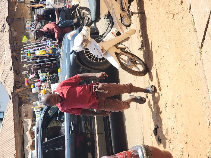 The image depicts an outdoor street scene under bright daylight in Maiburiji, Nigeria