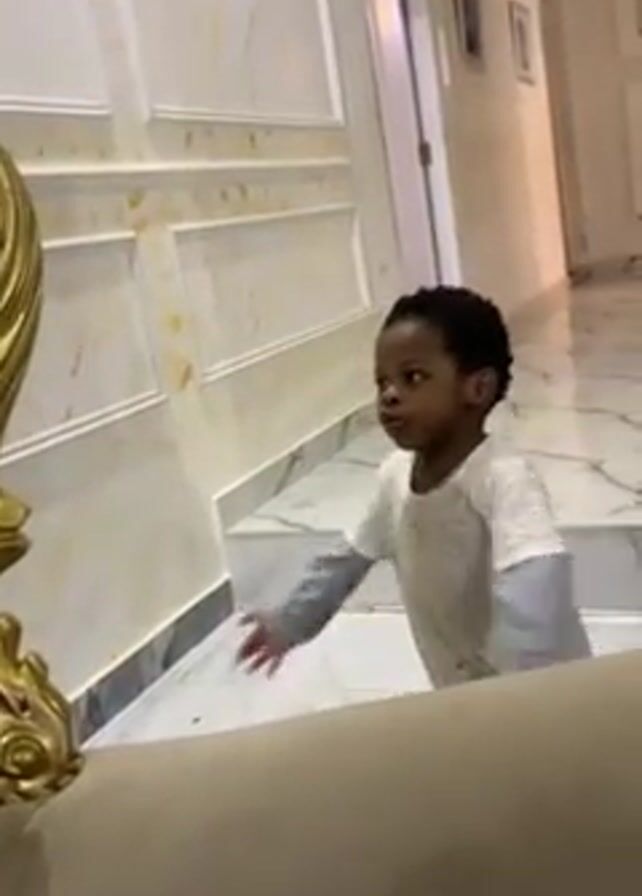 A young child with dark hair and light-colored pajamas crawls into view in the corner of a brightly lit room. They appear to be crawling away from a tan-colored couch. The walls are white with decorative molding, and the floor is white marble with gray veining. A hallway with a closed door and framed pictures is visible in the background. The child stands up and looks toward the right, then looks back to the left.