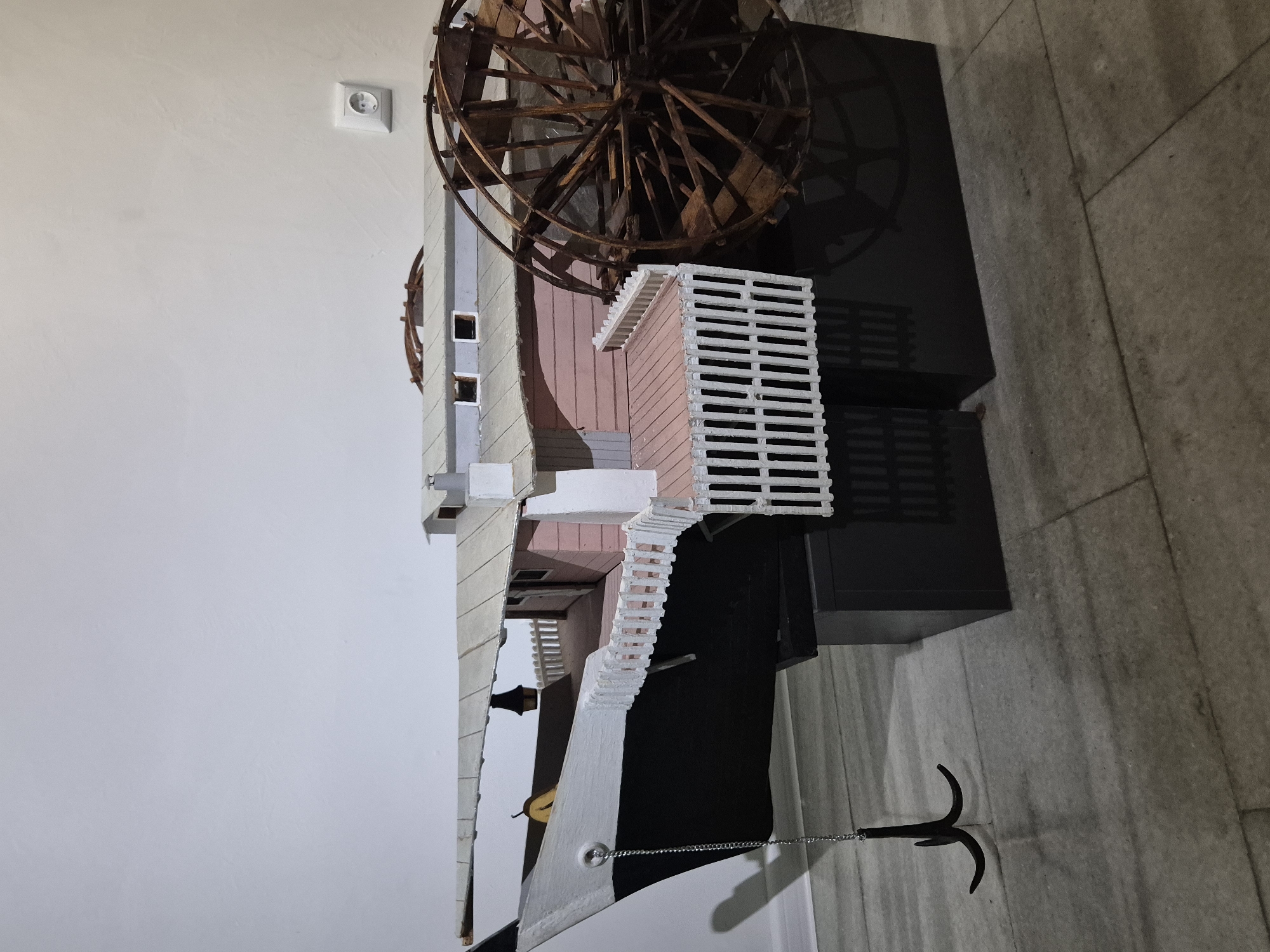 The image depicts a model ship, possibly a recreation of a historic vessel. The model features a water wheel, a multi-tiered deck structure, and an anchor attached via a chain. It sits on a black stand against a neutral backdrop that includes a wall with an electrical outlet. The location is Tutrakan, Bulgaria.