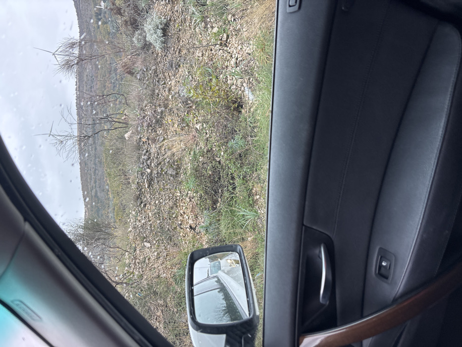 The image displays an exterior landscape captured from the passenger side of a vehicle in Kruče - Kërruçi, Montenegro. The vehicle's right-side window is speckled with water droplets. The interior shows a dark grey door panel with a silver door handle, a rectangular power window switch, and a dark brown vertical trim piece. The right-side rearview mirror, partially visible on the left, reflects a paved road and the front of a light-colored vehicle (likely white or silver) behind it, under an overcast sky. The exterior scene depicts a rugged, upward-sloping hillside characterized by abundant grey rocks and sparse vegetation. This vegetation includes patches of dry, light-brown grass, various small green shrubs, and several bare deciduous trees with dark, slender branches. On the crest of a distant hill, two large white wind turbines with visible blades stand against an overcast sky. A small, white structure, possibly a mosque or shrine with a dome-like roof, is situated on the hillside further down, to the right of the left-most visible wind turbine. The overall environment appears mountainous and stony. No individuals are present in the observable scene.