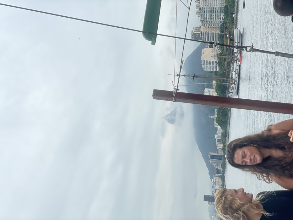 On a boat, two women stand facing left, with one woman's face more visible. The background reveals a city coastline, a mountain partially obscured by clouds, and a faint outline of the Christ the Redeemer statue. A docked white sailboat is present, along with parts of the boat the women are standing on. A cloudy sky completes the scene.
