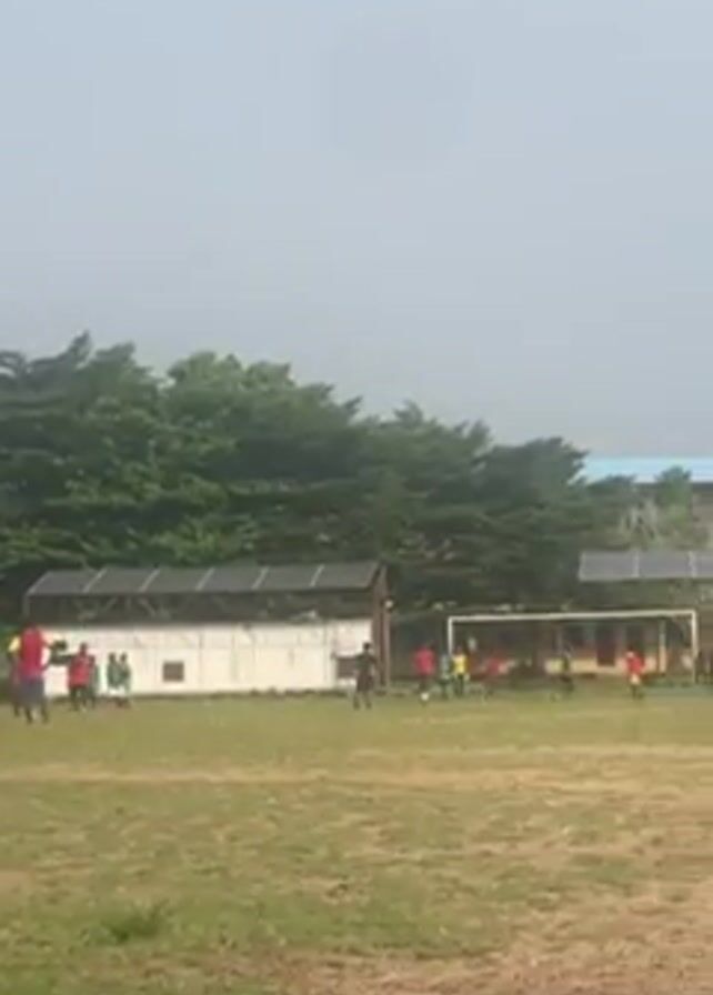 A grassy sports field with a few trees and buildings around the perimeter is shown under a hazy sky. Several children wearing bright colors, primarily red, green, and yellow, are scattered around the field, seemingly playing soccer. Two soccer goals stand at opposite ends of the field, and there are structures with solar panels attached to them on the sides. The ground is a mix of green grass and dry patches. The scene appears to be outdoors during daytime.