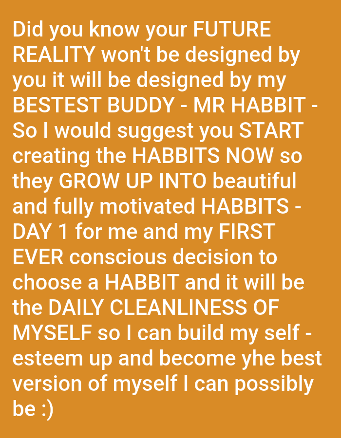 The image contains text on an orange background. The text conveys a motivational message about creating habits for a better future. It states that one's future reality won't be designed by oneself but by "MR HABBIT". The text encourages the reader to start creating "HABBITS" now so they grow into "beautiful and fully motivated HABBITS". It mentions "DAY 1" for the author and their first conscious decision to choose a "HABBIT" which will be the "DAILY CLEANLINESS OF MYSELF" to build self-esteem and become the best version of themselves.