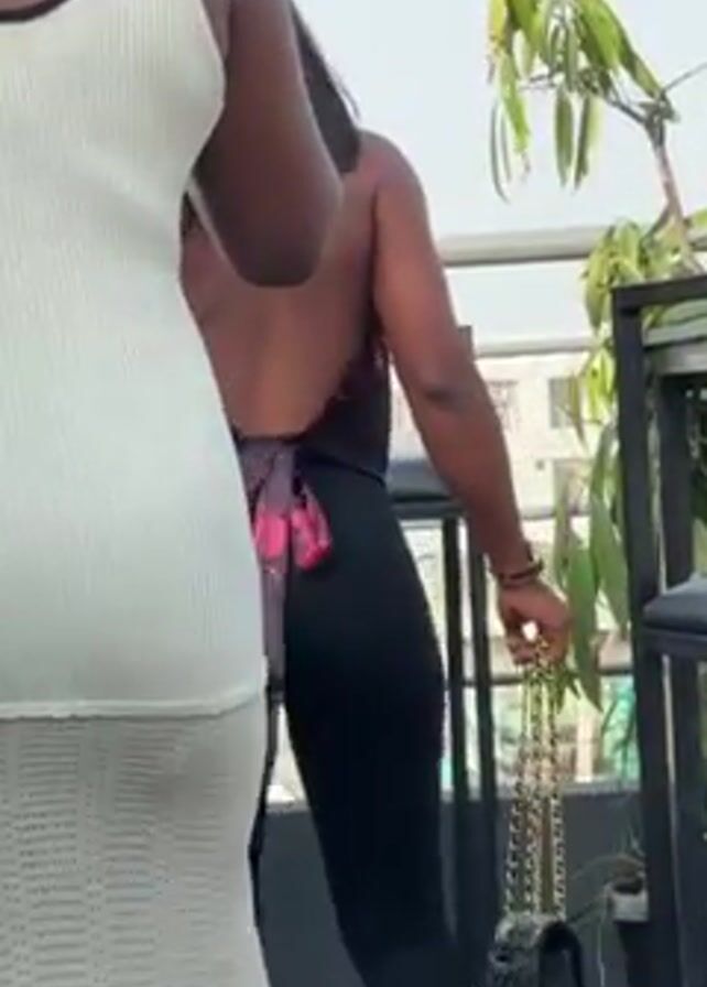 Two women are standing on a rooftop. The woman closest to the camera is wearing a fitted, white dress with black trim. The other woman is wearing a black top with a floral print at the bottom, black leggings, and she is carrying a quilted black purse with a gold chain. Both women have dark skin. There are plants and bar stools visible in the background. The woman in the black outfit turns and smiles while briefly raising her arms. A building is visible in the background.