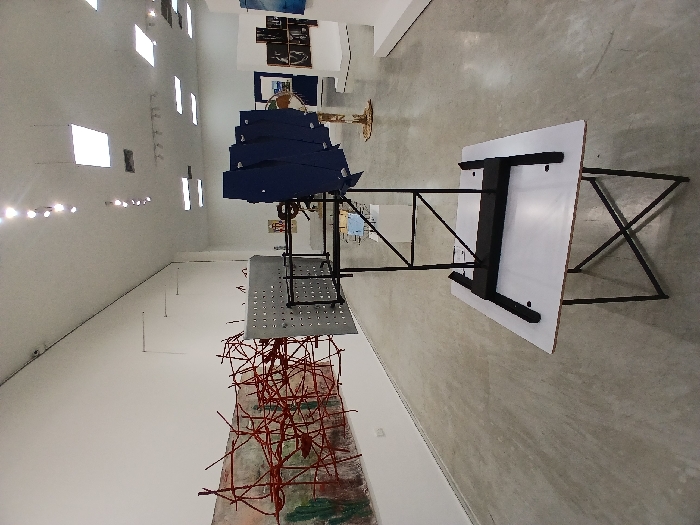 An art exhibit features a multi-tiered sculpture. The base is a chaotic arrangement of red rods resembling a nest. Above this is a metal platform with holes. A black framework supports a stack of blue curved shapes. Finally, a white tabletop with black metal legs stands on the right, connected to the rest of the sculpture by the framework. The exhibit is in a large, modern gallery with a concrete floor and white walls.