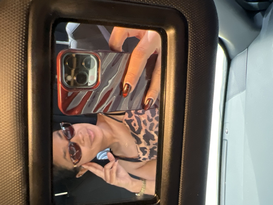 A car's vanity mirror reflects a person taking a selfie with their phone. The person is wearing sunglasses and a leopard-print top, and the phone case has a red and gray patterned design. A gold bracelet is visible on their wrist. The interior of the car can be seen around the mirror, including the sun visor.