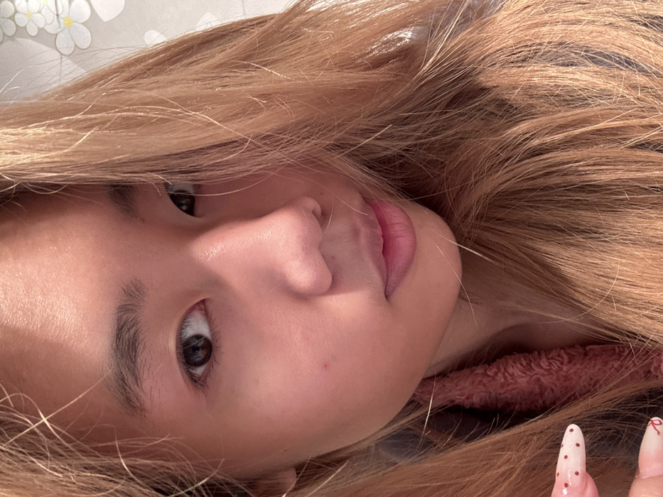 A young woman's face is centered with her light brown hair surrounding her. Her eyes, nose, and mouth are clearly visible, and she has fair skin. Part of a pink garment is visible at the lower right, near two fingernails that are painted with a white base and pink spots. The background is a light floral pattern. The image is rotated counter-clockwise.