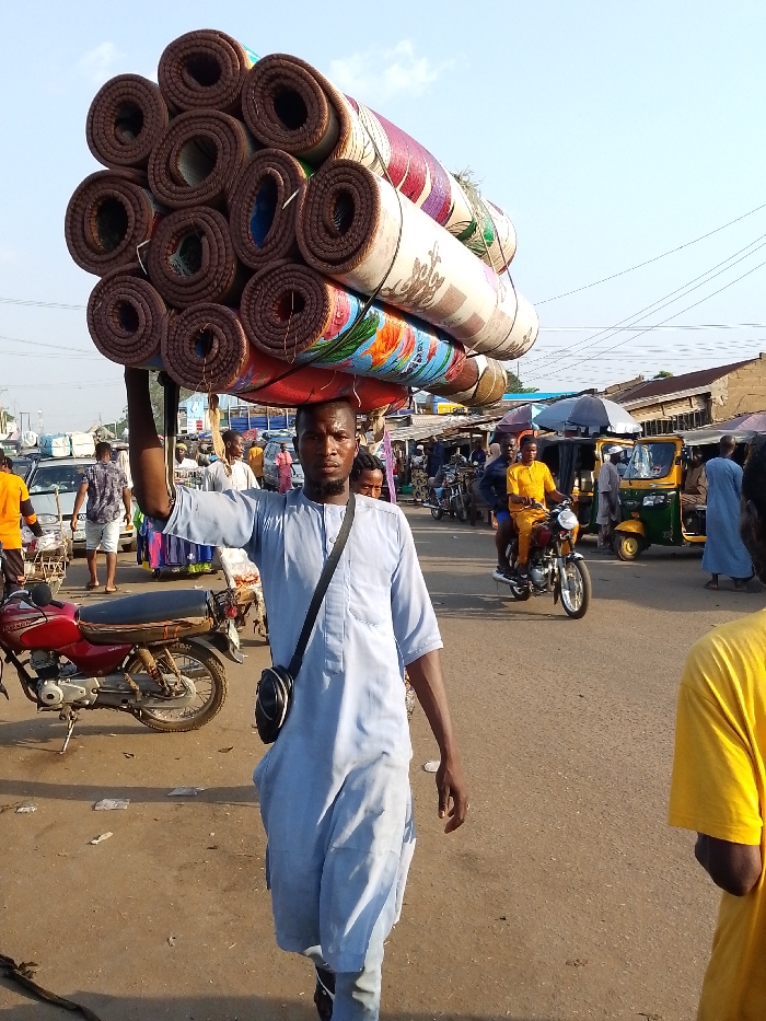 A man in a light blue tunic carries a large stack of rolled mats on his head, walking on a paved road. The background shows a busy street scene with pedestrians, motorcycles, and vehicles. A red motorcycle is parked to the left, and various market stalls or shops line the street. The sky is visible in the background, suggesting it's daytime.