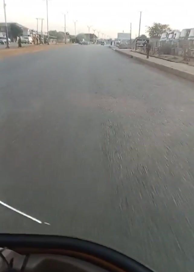 view from inside a vehicle, likely a car or truck, driving on a paved road. The road appears straight and wide, with streetlights lining both sides. There are a few cars and people visible in the distance. The sky is overcast, suggesting it may be early morning or late afternoon. The roadside is somewhat unkempt, with some debris and dry vegetation visible.