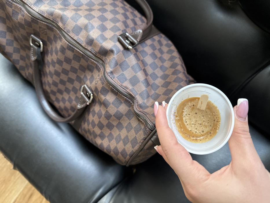 A close-up, high-angle shot features a left hand, displaying a French manicure, holding a small white disposable plastic cup. The cup contains a dark brown liquid topped with a light brown foam (crema) and a small wooden stirrer stick. In the background, a large brown and dark brown checkered patterned bag, consistent with the Louis Vuitton Damier Ebene design, rests on a black upholstered surface, likely a seat. The bag has visible brown trim, handles, and a top zipper. A portion of a light brown wooden surface is visible in the upper left background. The specific location in Senokos, Bulgaria, cannot be determined from the visual information presented.