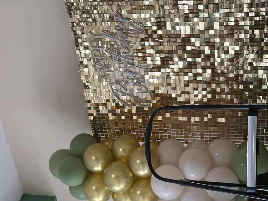 A decorative backdrop of small, gold-colored square panels is partially visible, featuring a silver "Happy Birthday" sign