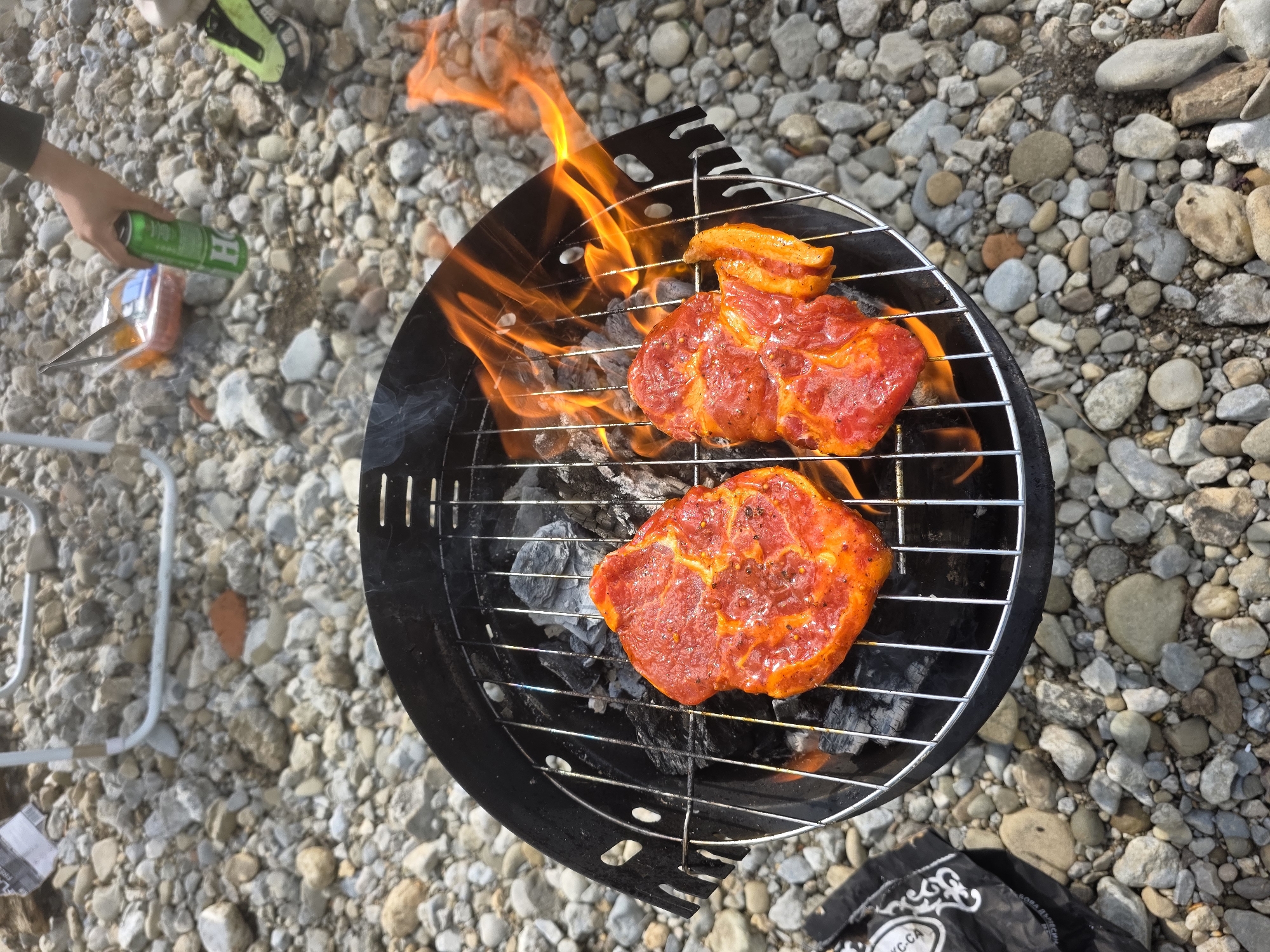 A top-down shot shows a charcoal grill with two pieces of meat cooking over flames. The meat is reddish-orange in color and appears to be marinated or seasoned. The grill is round and black, with a metal grate holding the meat above the burning charcoal. Flames are visible rising around the meat and through the grate. The grill is placed on a pebbly surface, which appears to be a beach or riverbank. The pebbles are a mix of gray and white, with varying sizes. In the background, a person is partially visible, holding a green can. Next to them, there are green sneakers and a white foldable chair. The overall setting suggests an outdoor cooking activity, possibly a barbecue. The city and location are unknown.