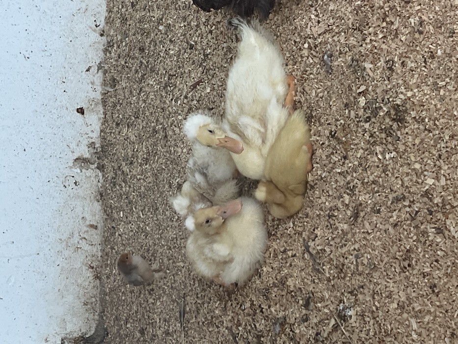The scene, located in Barza Municipality, Syria, depicts an indoor animal enclosure. The floor is covered with a uniform layer of light brown wood shavings. A light-colored, possibly concrete, wall with visible stains and textured discoloration lines the background. Five young birds are present. In the lower-center of the frame, a cluster of four light-colored ducklings, primarily off-white with hints of yellow and pinkish bills, are resting or huddled together. One duckling within this group is a distinct tan-yellow color and appears to be asleep with its head tucked. Separately, a single, smaller brownish-grey chick stands alone in the upper-left portion of the frame, facing towards the right. No human presence or specific interactions between the chick and ducklings are observed.