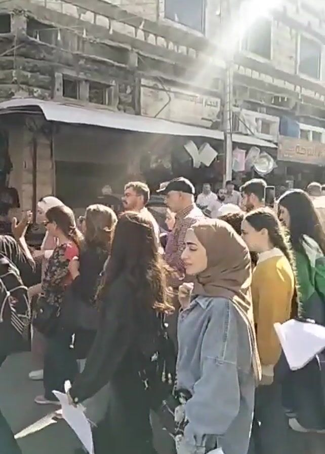 crowd of people walking down a street in what appears to be a city. The crowd includes both men and women of varying ages, with some wearing traditional Middle Eastern clothing like headscarves. Several people are holding up their phones, presumably to take pictures or videos. The street is lined with buildings, some of which have shops on the ground floor. The sun is shining brightly, creating a bit of glare in the video. There's a general sense of movement and activity in the scene.