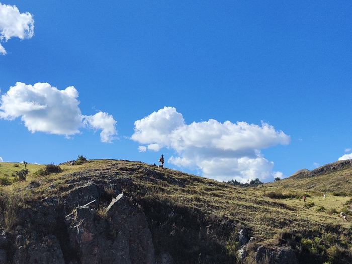The image displays an Andean highland landscape located in the vicinity of Cuzco, Peru. The scene is illuminated by direct sunlight under a bright blue sky sparsely populated with white cumulus clouds. The foreground consists of dark, rugged rocky outcrops and dry, sparse vegetation. A prominent grassy hill occupies the midground, featuring exposed rock formations and patches of yellowish-green grass. On the crest of this hill, a single individual stands with their back to the viewer, wearing a wide-brimmed hat and a reddish garment over their shoulders. To the right and further down the hill, three light-colored animals, identifiable as llamas or alpacas, are observed grazing on a patch of greener grass. A second, smaller human figure is present further in the background, near the grazing animals. Distant rolling hills form the backdrop.