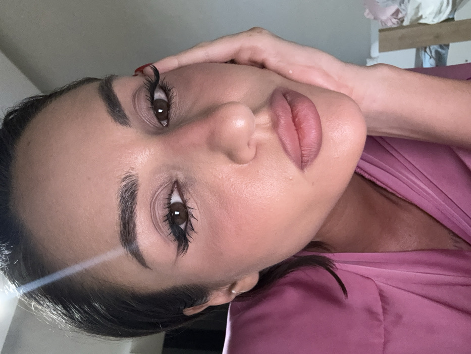 A woman with fair skin gazes into the camera. She has dark hair, full lips with mauve lipstick, and striking eyebrows. Her long eyelashes are heavily mascaraed. Her right hand is raised near her forehead. She is wearing a dark pink silky shirt or robe. The background is blurry, but appears to be an interior space.