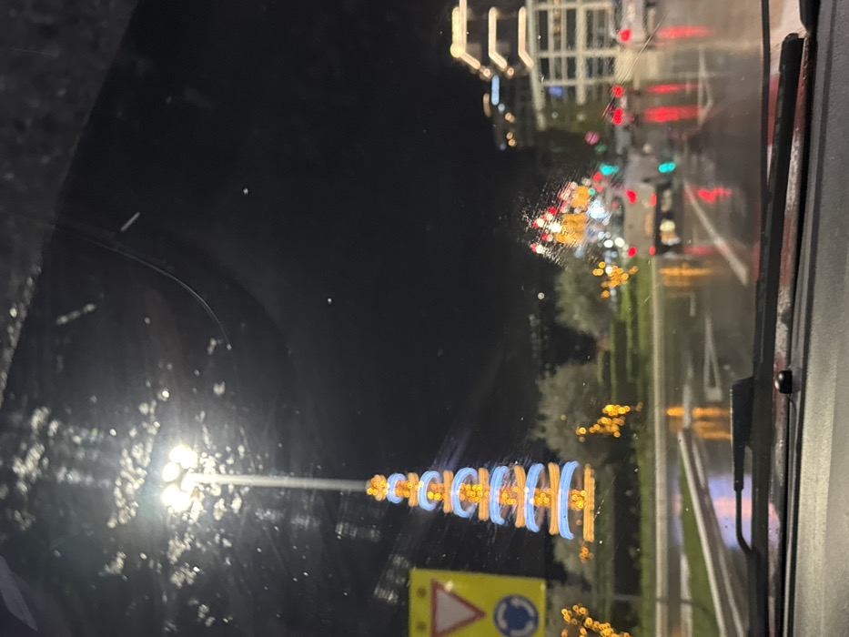 A nighttime view through a car windshield shows a rain-slicked road with blurred city lights and reflections. A lit, Christmas-tree-shaped structure with blue and gold lights is visible on a pole, near a yellow traffic sign indicating a roundabout. The windshield has water droplets and smudges, blurring the scene. A building with illuminated windows is seen in the distance, along with red and green traffic lights.