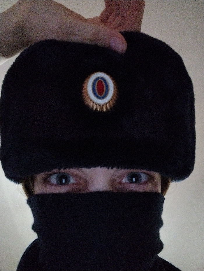 The image displays a close-up headshot of an individual, purportedly located in Saratov, Russia, against a plain, light-colored indoor background. The subject's face is largely obscured by a black fabric mask covering the nose and mouth, and a dark, possibly fur, ushanka-style hat. Two light-colored, wide-set eyes are visible, staring directly forward. A small portion of light brown hair is visible between the hat and the mask. The hat features a central circular emblem consisting of a red inner ring, a white middle ring, and a blue outer ring, surrounded by a gold-colored, serrated border, consistent with a Russian Armed Forces cockade. A light-toned hand is positioned above the hat, apparently holding or adjusting it.