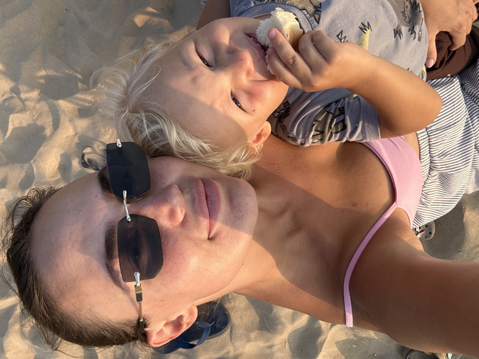 An overhead photograph captures an adult female and a young child lying on a sandy surface in the city of Phú Quốc, Vietnam. The female, positioned on the left, has dark hair pulled back and is wearing rimless dark sunglasses with gold-colored arms, a light pink bikini top, and light-colored striped shorts. Her right hand is out of frame, while her left arm supports the child. A blue flip-flop is visible on the sand near her head. The child, situated to her right, has blonde, curly hair and is wearing a grey t-shirt with dark patterns. The child is actively biting into a piece of white bread held in their right hand, facing the camera with a wide smile. The female's expression is neutral, also looking towards the camera. Warm, directional light casts soft shadows across the rippled sand, indicating an outdoor setting, likely a beach, during a golden hour.