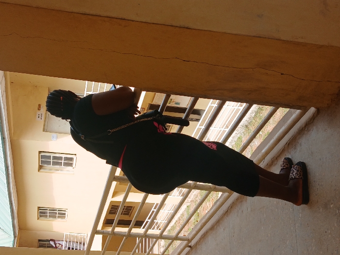 The image depicts an outdoor scene on an elevated concrete walkway or balcony in Ugi Majowel, Nigeria. An adult female, viewed from behind, is the primary subject. She wears a black short-sleeved top, black capri-length leggings with a pink/red trim on the upper portion and a potential graphic on the left leg, and leopard-print slip-on sandals. Her hair is styled in dark braids. A black bag with a silver-colored chain strap is slung over her left shoulder. She is leaning against a light-colored metal railing, holding a dark-colored smartphone in both hands, appearing to engage with the device. To the immediate right, a tan-colored concrete pillar exhibits a prominent vertical crack. In the background, a two-story building with light tan-colored walls is visible, featuring multiple white-framed windows and a light green sloped roof. A white door marked with "STAFF" is discernible on the upper floor. Beyond the railing, sparse ground vegetation can be seen.