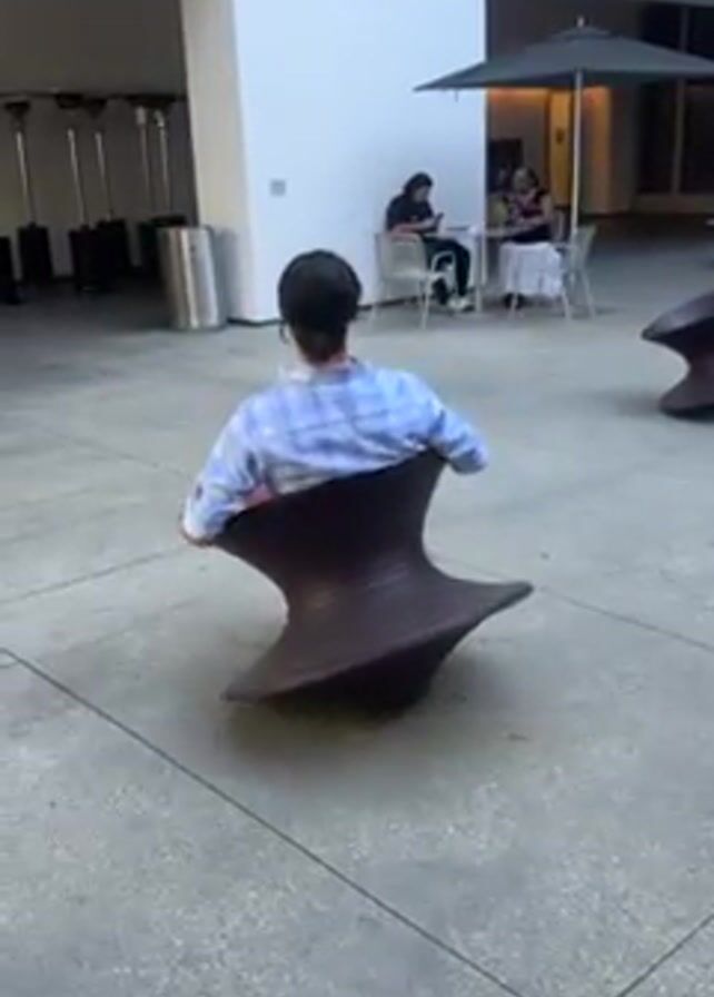 Here is a detailed description of the video: The video shows a man sitting in an unusual chair and rotating in it. The chair has a unique shape, similar to a top, with a wide, flat base and a narrower top where the man sits. The chair appears to be made of a dark, possibly wood-like material. The man is wearing a light blue plaid shirt and maroon pants. He initially sits upright but then leans back, rotating the chair with his movements. The background is an outdoor plaza or courtyard with a concrete tile surface. There are other chairs of the same design scattered around. In the distance, people are sitting at tables under umbrellas. Some architectural elements, including a building façade and tall bamboo plants, are visible in the background. The camera moves around the man as he rotates in the chair, providing a full view of his actions and the environment.