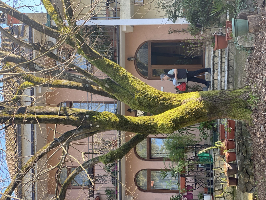 The image depicts a residential property in Virpazar, Montenegro, under clear daytime conditions. A two-story building with a pink or peach-toned facade, a terracotta tile roof, and dark-framed arched windows and doors on the ground floor is visible. A first-floor balcony with dark metal railings is lined with potted plants. A large, leafless deciduous tree, centered in the foreground, dominates the yard. Its trunk and major branches are extensively covered in vibrant green moss, especially on the sunlit left side. An elderly individual, appearing female, with grey hair and wearing glasses, a light shirt, dark vest, and dark trousers, is stepping down stone stairs from the building's main arched doorway. She carries a red bag and a white object in her left hand, and a dark walking aid in her right hand. The ground around the tree is composed of dirt and scattered fallen leaves. Various potted plants are arranged on a low stone wall to the left of the tree, on metal stands, and directly on the ground in front of the building. Bright sunlight illuminates the scene from the left, creating distinct shadows. A section of an adjacent structure featuring a white pillar and another balcony is visible on the far right.