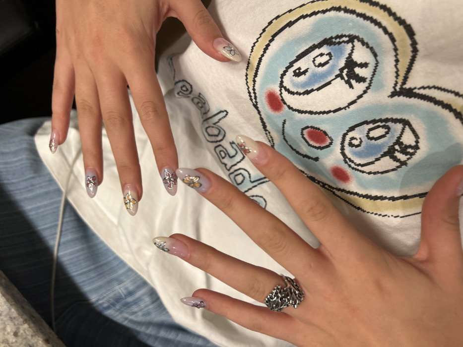 The image displays a close-up, overhead view of two hands, likely belonging to one individual, showcasing recently manicured fingernails. The hands are resting on a white garment, possibly a t-shirt, which features a multi-colored graphic design consisting of stylized cartoon faces in shades of blue and red, with partial black text that appears to read "Rage". All visible fingernails are long, almond-shaped, and feature intricate designs over a translucent, light-colored base. The designs include small, metallic-toned flowers and butterfly-like embellishments in both silver and gold/bronze hues. The ring finger of the left hand is adorned with a prominent silver-toned ring featuring an elaborate, organic, branch-like or coral-like pattern. In the upper left background, a segment of a light gray, possibly granite or marble, countertop is visible, with a thin white cable extending across it. Below this, a blue denim-textured fabric is partially seen. The scene is set indoors in Whistler, Canada.