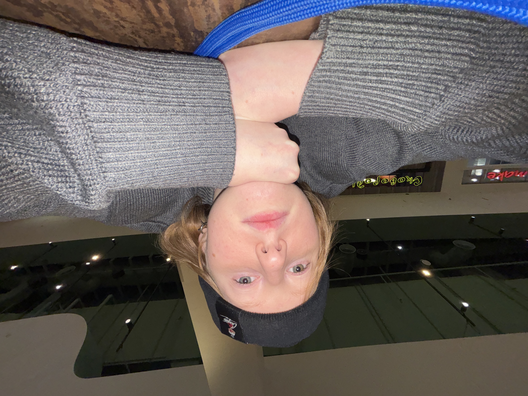 A pale-skinned person with light brown hair wearing a black beanie and a gray sweater is positioned upside down in the frame. The person's face is in the center, and their arms are crossed beneath their chin, resting on the sleeves of the sweater. A blue strap is visible near the person's neck. In the background, lights are embedded in a dark ceiling. Outside a window, in Russian, the word "Crocodel" is visible. A sign in a window displays the word "make." Based on the Cyrillic alphabet used in the signs, the location is Perm, Russia.