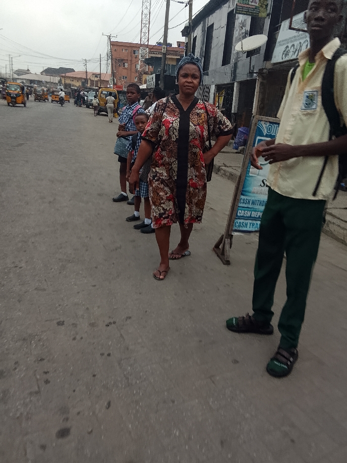 The scene depicts a street in Agani, Nigeria, characterized by a paved roadway and multi-story buildings. In the immediate foreground, to the right, a young male stands partially visible, wearing a light-colored collared shirt over a green undershirt or trim, dark green trousers, and dark sandals with green accents, carrying a black backpack. His hands are positioned near his waist. In the mid-ground, slightly left of center, an adult female is positioned, facing forward with her left hand on her hip. She wears a patterned knee-length dress featuring brown, black, white, and red abstract designs with a vertical black panel, and a dark headwrap, along with flip-flops. Behind her, lined up from left to right, are three children, appearing to be students, dressed in blue and white plaid uniforms (shirts and shorts), dark shoes, and white socks. The youngest child is partially obscured. In the background, the street extends, populated by several yellow tricycle taxis (keke napep), other vehicles, and pedestrians. Buildings with corrugated metal facades and satellite dishes line the street, with power lines and utility poles overhead. A partial view of a cell tower is visible in the distance. To the right of the adult female, a wooden A-frame sign advertises financial services, with visible text including "CASH WITHDRAWAL," "CASH DEPOSIT," and "CASH TRANSFER." The overall environment appears to be an active urban or commercial area under an overcast sky.