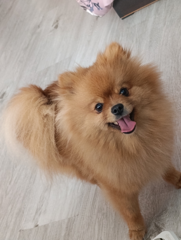 A reddish-brown Pomeranian dog is observed in an indoor environment, depicted from an elevated perspective looking down at the subject. The dog is positioned on a light grey wood-laminate floor, its four paws resting on the surface. Its head is tilted upwards, facing the camera, with its mouth slightly ajar and a pink tongue protruding. The dog's eyes are dark and appear focused. Its coat is dense and fluffy. In the upper right portion of the background, out of focus, a dark, flat object is partially visible next to a light-colored item featuring a floral or patterned design. The specific location within the city of Haskovo, Bulgaria, cannot be determined from the visual information provided in the image.