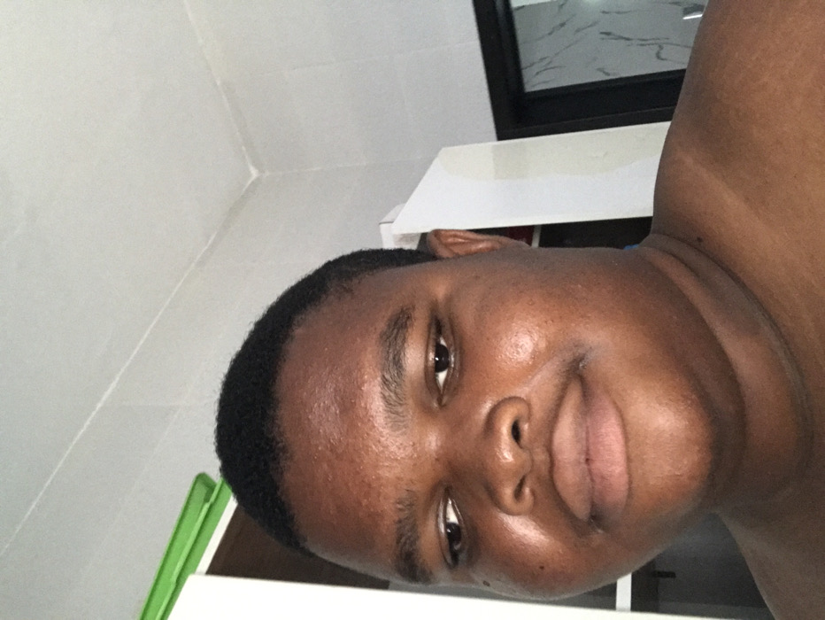 The image displays a close-up, frontal self-portrait of one individual, an adult male with dark skin, short dark hair, and a round facial structure. He is shirtless. His expression is neutral to slightly smiling, with his gaze directed slightly downward and to the right. The scene is indoors. In the background, to the subject's left, a white cabinet or shelving unit with a bright green object on its upper surface is partially visible against a light-colored wall with visible seams, possibly tiles. To the subject's right, a dark-framed door, dark in color and exhibiting a subtle reflective pattern, is present next to a plain white wall segment. The ceiling is white with discernible panel seams. No visual evidence within the image confirms a specific location within the city of Ado, Nigeria.