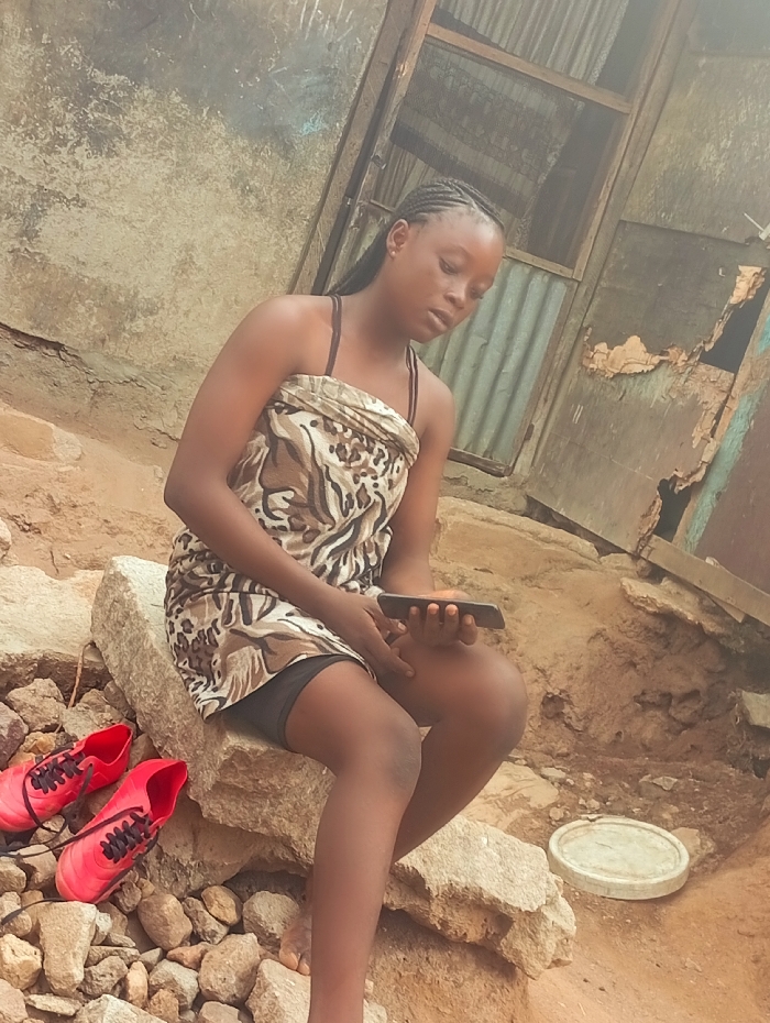 This image depicts a young female sitting outdoors on a large light-colored rock in Adankolo, Nigeria