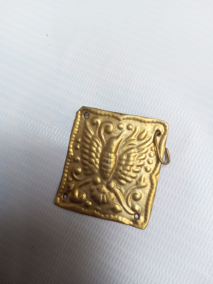 The scene, located in Qarabucaq qəsəbə, Azerbaijan, displays a single metallic object against a light-colored, textured background. The object is a roughly square-shaped plaque or plate, approximately 5-7 cm in length, appearing to be crafted from brass or a similar golden-hued metal. It features a raised, embossed design depicting a central winged creature, possibly a bird or griffin, with prominent wings spread upwards and outwards, facing towards the right. This creature is surrounded by intricate, swirling scrollwork or floral motifs. Four small, circular holes are present, one near each corner of the plate, suggesting it was designed for attachment. A small, bent, C-shaped metal hook is attached to the right edge of the plate, extending outwards. The metal surface exhibits a somewhat dull, aged finish with minor surface irregularities. The object rests on a light, possibly off-white, textured surface that shows faint creases and a subtle grain, consistent with fabric or a similar material. Lighting is even and diffuse, casting soft shadows beneath the metallic object. There are no individuals present, nor are any actions or interactions depicted.