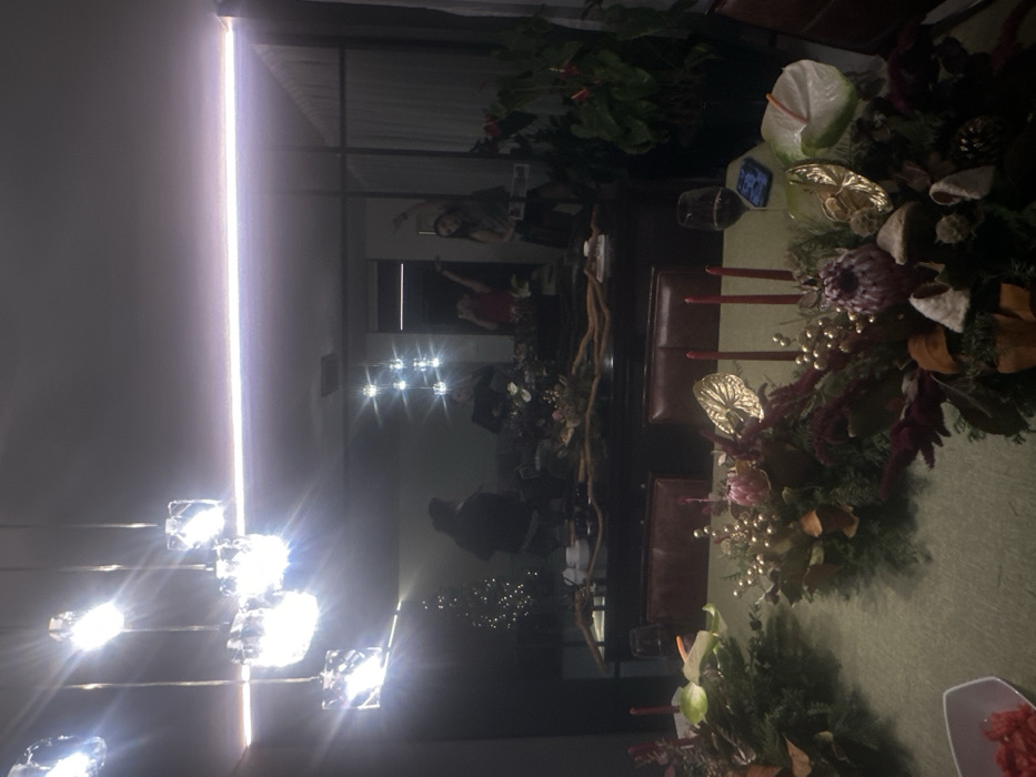 The photo shows a table with a lush floral centerpiece featuring Protea, Anthurium, greenery, candles, and gold accents. A chandelier hangs on the left. The scene is a reflection in a mirror behind the table showing people celebrating near a Christmas tree. A cell phone sits on the table.