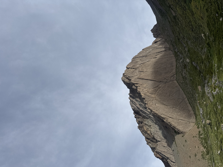 A towering rock formation dominates the right side of the frame, exhibiting a sheer face with visible layers and crevices. The lower portion of the cliff merges into a grassy slope. Above and to the left, a cloudy, grey sky fills the remaining space, creating a stark contrast with the textured rock and adding to the expansive feel of the landscape.