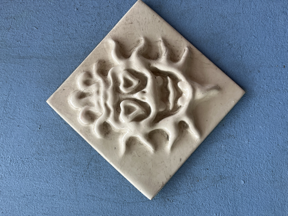 - "A single, off-white ceramic tile, oriented as a diamond, is mounted centrally on a textured, matte blue wall" by FM-rOKEu2, licensed under CC BY 4.0