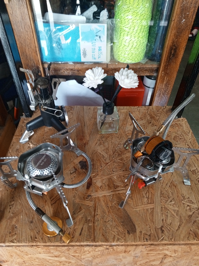 The scene depicts an interior setting, identified as being in Baza, Myanmar. Two portable camping stoves are positioned prominently on a light-colored, textured wooden surface, possibly oriented strand board. The stove on the left is silver-toned, marked "MINISPORT BRS-201" on its burner, featuring folding pot supports and a flexible braided hose connected to a brass-colored gas regulator. The stove on the right is similarly constructed from silver metal with folding pot supports and a flexible hose; an orange and black strap secures its central component. Between and slightly behind these stoves stands a clear glass square diffuser bottle with a black cap, from which two white artificial flower-like objects protrude. In the background, behind a glass barrier, is a wooden shelving unit containing various items. On a shelf directly behind the diffuser, a light blue fabric item with "HiCool UV this cuff" printed on it is visible, next to a roll of bright lime green cordage. To the left, on a lower shelf, a black mechanical object with a white safety pin attached rests. Further to the right, a red rectangular container is partially visible. No people or active interactions are present in the image.