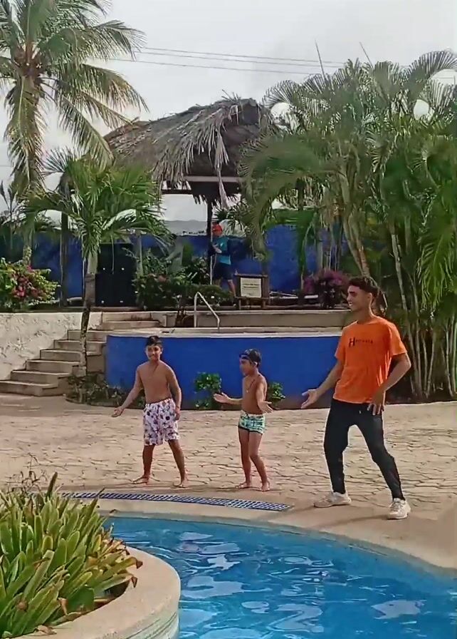 three males dancing along the edge of a pool, presumably at a resort. Two are young boys dressed in swim trunks, and one is a young man wearing an orange t-shirt and dark pants. He seems to be leading the dance. They are on a paved area next to a blue-tiled swimming pool surrounded by tropical plants and palm trees. In the background are some thatched-roof structures and other resort buildings. The sky is overcast. The camera is relatively stable.
