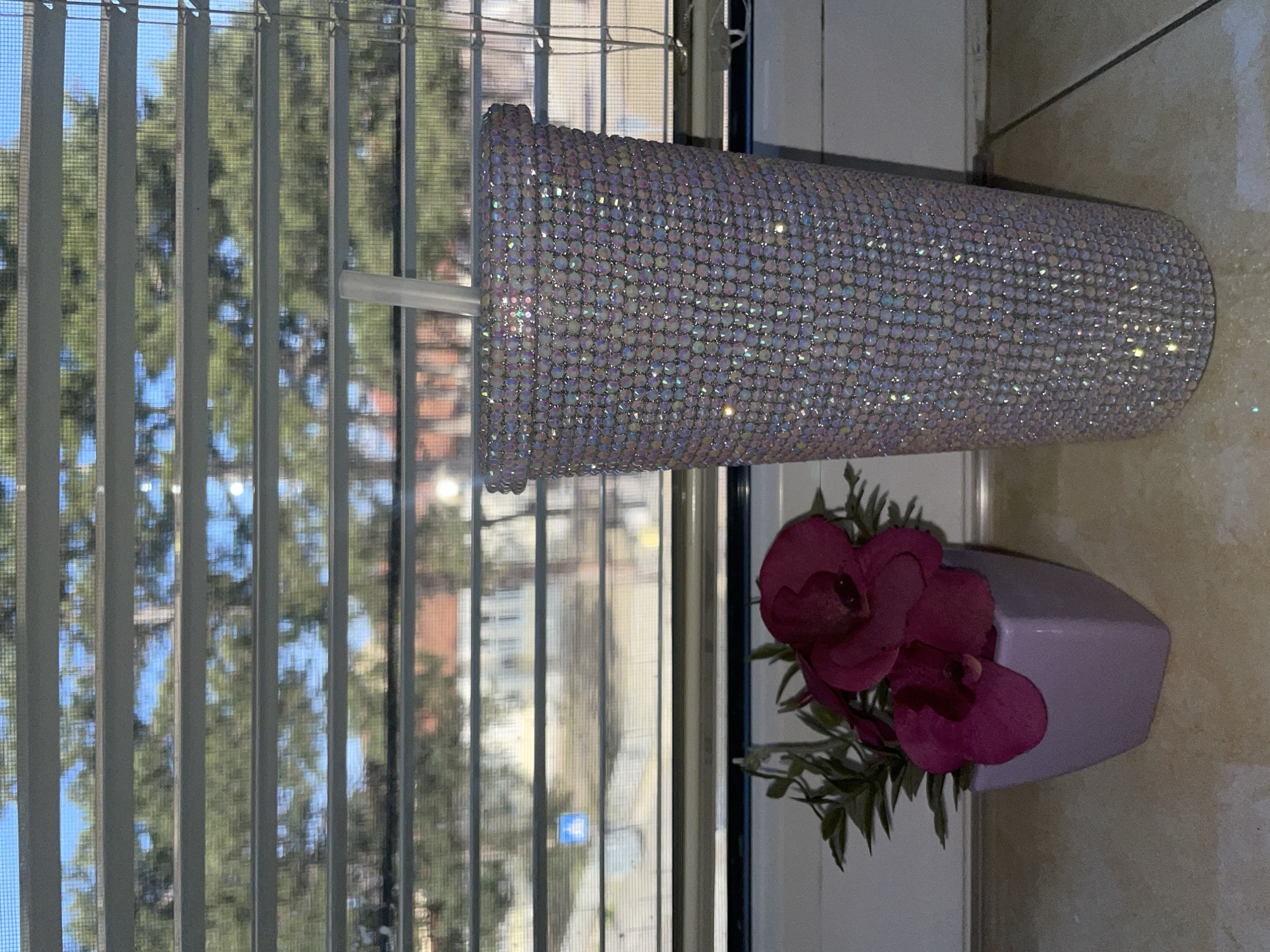 The scene is set indoors, looking out a window in the city of Sungurlare, Bulgaria. In the foreground, positioned on a light-colored tiled surface with visible grout lines, are two objects. On the right, a tall, tapered tumbler is entirely covered with iridescent, reflective rhinestones, and a clear or white straw protrudes from its top opening. To the left of the tumbler, a small, square, light purple ceramic pot holds artificial flowers, featuring two prominent deep magenta blossoms and several green leaves. The background view, observed through partially open horizontal window blinds and a fine mesh screen, shows an outdoor environment under bright daylight. Elements visible outside include a dense canopy of green trees, sections of blue sky, distant buildings with terracotta-colored roofs, and a street or pathway where a blue square traffic sign with a white arrow is discernible on the left side.