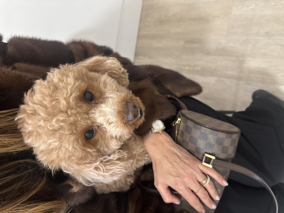 An indoor scene depicts a female individual, partially visible, holding a small dog. The exact location within the city of Torres Vedras, Portugal, is not discernible from the image. The individual, whose head and upper torso are mostly out of frame, wears a dark brown fur coat. Her left arm and hand are prominent, adorned with a gold-toned wristwatch with a white dial and two rings: one plain gold band and one with multiple stones. She is holding a small, cylindrical handbag featuring a brown checkered pattern with a gold zipper. Her lower body is clad in black trousers or a skirt, and dark shoes are visible on the light-colored floor. The dog is a small, light brown (apricot) canine with curly fur, consistent with a Poodle or similar breed. It is positioned in the individual's arms, facing forward, with dark eyes, a dark nose, and a slight showing of its upper front teeth. The background consists of a plain white wall and a light-toned floor, possibly wood laminate, displaying visible seams.