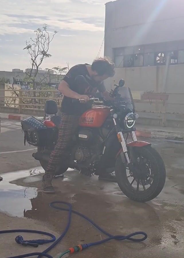 Here is a concise description of the scene: A man is on a red motorcycle in an outdoor setting. The motorcycle is a VAMOTOR brand and appears to be in a wet area, possibly having been washed or rained upon. A blue garden hose and nozzle lie on the ground. The man is wearing a black T-shirt and plaid pants. He appears to be checking or adjusting something on the motorcycle's front area. The background includes a building with windows, some fencing, and a cloudy sky. The scene is well-lit with sunlight, but the sun is slightly obscured, creating a soft light.
