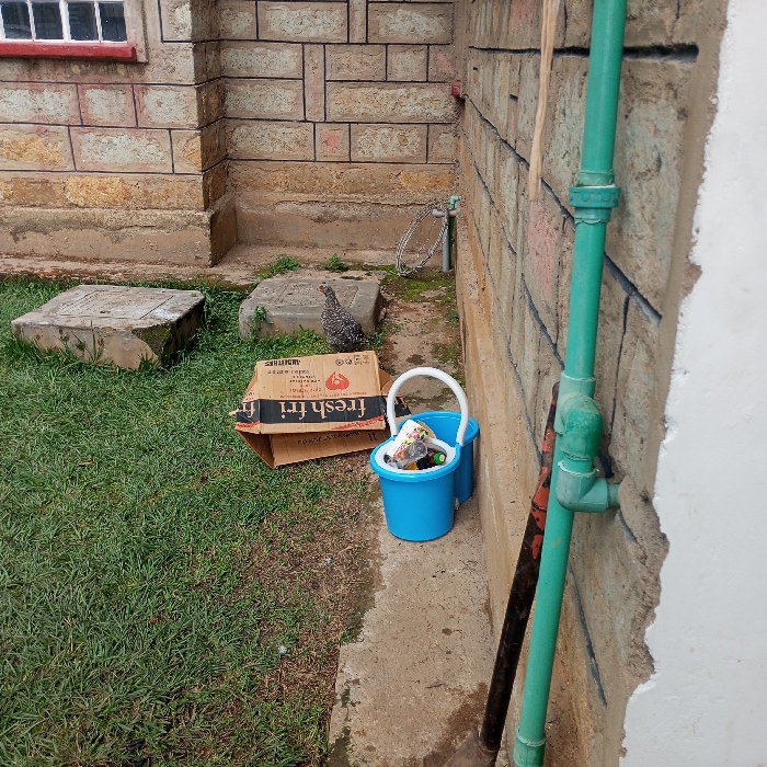 The scene is an outdoor area in Mahiakalo ward, Kenya, against a light brown block wall, under natural light. A speckled chicken stands on green grass in the mid-ground, positioned between two rectangular concrete utility covers and a partially collapsed brown cardboard box labeled "fresh fri". A blue plastic bucket with a white handle, containing miscellaneous items, rests on a concrete path adjacent to the wall, slightly in front of the box. A dark, elongated tool or stick leans against the wall directly behind the bucket. A vertical green plastic pipe assembly is fixed to the wall on the right side of the frame. In the background, the block wall features a window with white frames and red trim, and a wall-mounted water tap with a coiled wire nearby. The far-right edge of the image shows a section of a white plastered wall. No human figures are present.