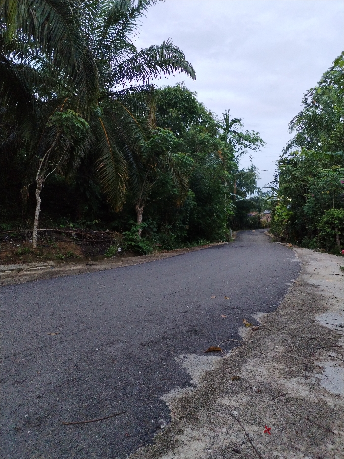This image captures an unpopulated section of an asphalt road in Mns Alue, Indonesia, under an overcast sky