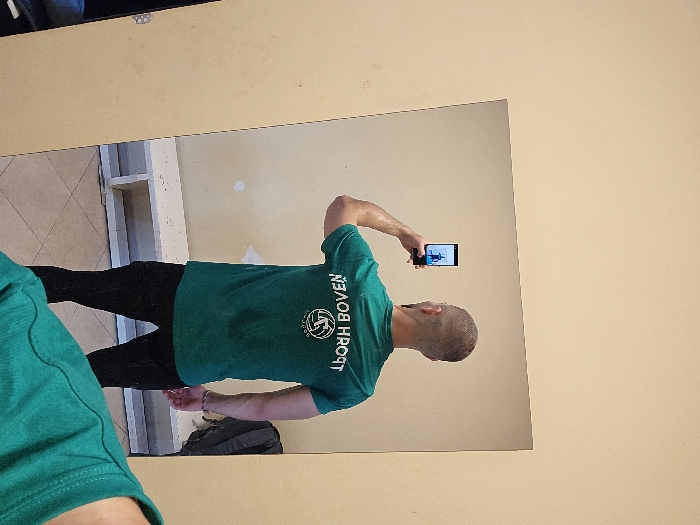 An indoor scene is depicted, with a male subject photographed from behind in a mirror. The subject has a closely shaved head and a short beard, wearing a dark green short-sleeved t-shirt with reversed white Cyrillic text "ПЛЕВЕН СПОРТ" (Pleven Sport) and a circular logo featuring a stylized figure engaged in a sport, consistent with a sports club or organization located in Pleven, Bulgaria. He wears dark pants and holds a black smartphone in his raised right hand, capturing his reflection. The phone's screen displays a similar mirror image. The room features light beige-yellow walls with visible patches of lighter paint, suggesting wear or repair. A low, white wooden bench or shelf is visible against the far wall. The floor is covered in light-colored square tiles. A dark backpack is leaning against the wall to the right of the subject's reflection. The lighting is even, suggesting an artificially lit interior, likely a changing room or sports facility within the city of Pleven, Bulgaria.