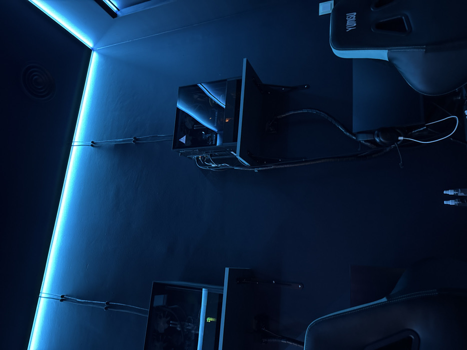 The image depicts an interior view of what appears to be a gaming cubicle or a section of a gaming café