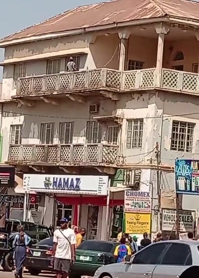 three-story building with a man standing on the top balcony. He appears to be pulling a rope or cable that extends from the balcony above him. The building is painted in a faded, light color and has decorative ironwork on the balconies. Below the building are storefronts, including one with a sign that reads "HAMAZ." There are cars and pedestrians on the street in front of the building. The overall environment suggests a bustling urban area during daylight.