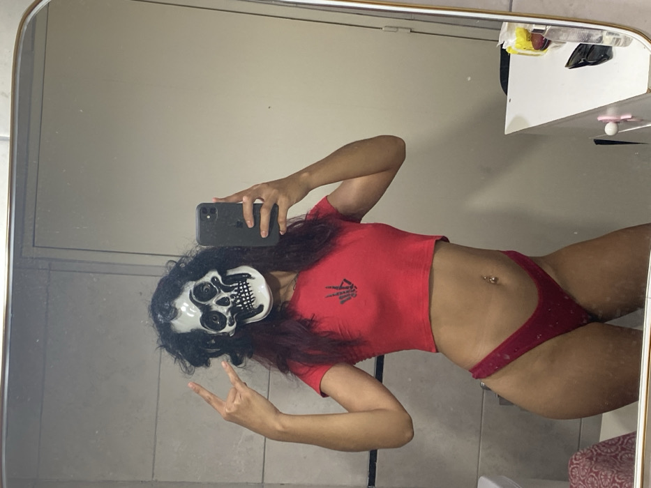 A person wearing a skull mask and red crop top and bikini bottom poses in front of a mirror, holding a smartphone to take a selfie